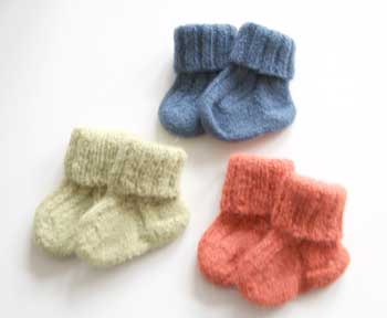 Babysokker i Indiecita (100 % alpakka) og i "Dansk merino" (de blå). Strikket efter opskrift i Anne-Marie Øbys bog "Strik og sy til den lille ny" - Hælen er dog ikke en timeglashæl som i opskriften, da jeg simpelthen ikke kan få den pæn.