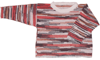 "Tiger"- Maskinstrikket børnetrøje i Opal strømpegarn. Kanterne på bul og ærmer er lavet som hvide tigertænder (musetak-kant) med råhvidt opalgarn. Halskanten er ligeledes strikket med råhvidt opalgarn. Trøjen er strikket efter Vibeke Warthoes udførlige vejledning. Der er gået 100 g garn til trøjen.